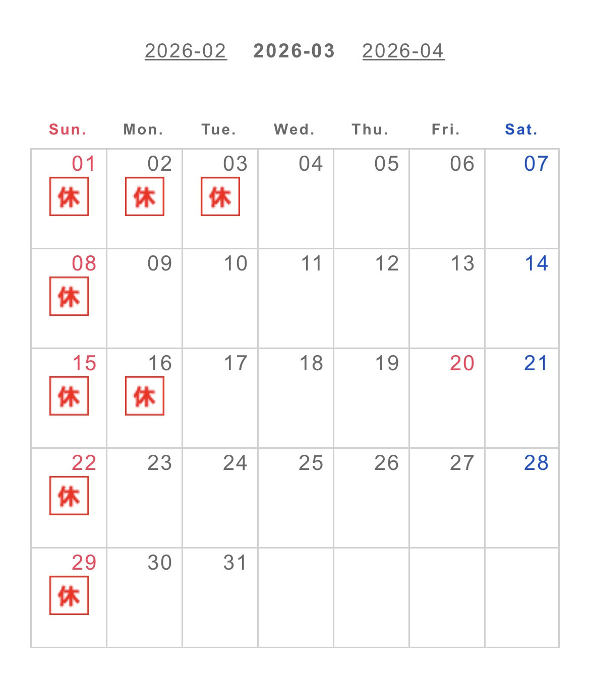 3月は、定休日の日曜日と第1.3月曜日